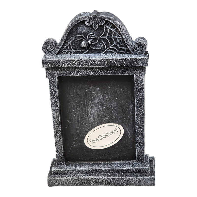 Elevate your Halloween decor with this spine-tingling chalkboard tombstone! Standing at 8 inches tall and 5 inches wide this creatively designed piece features a spooky skull atop an ornate engraved frame perfect for setting a creepy yet fun vibe at your festivities. The textured resin surface gives it an authentic graveyard feel making it a standout addition to your haunted house setup or outdoor display.