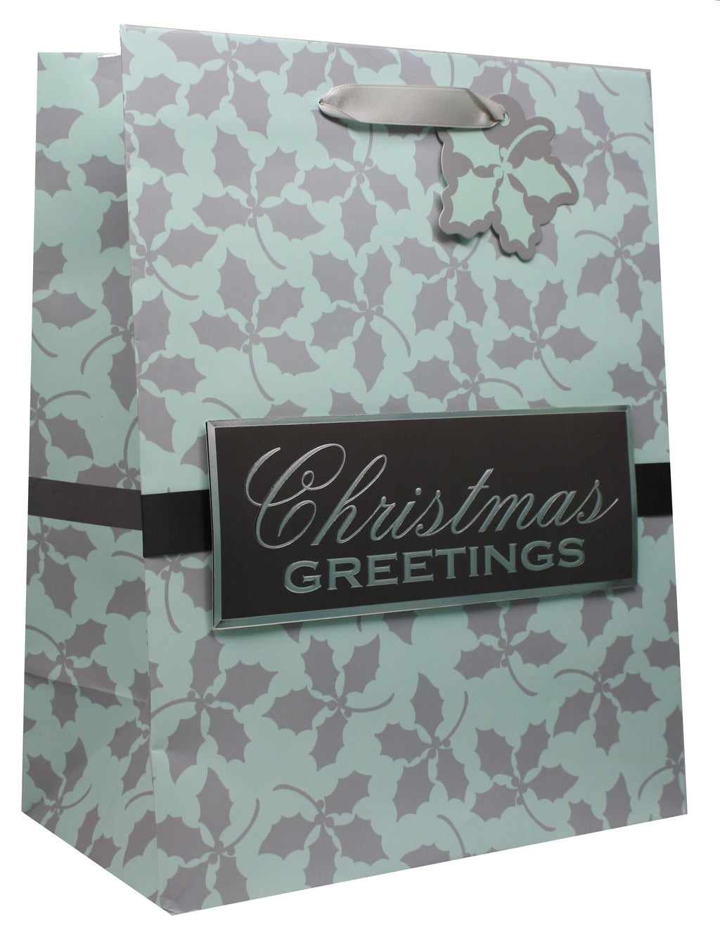 This Christmas, make a statement with this beautiful light blue gift bag! Featuring a festive grey holly design and a sign that reads "Christmas Greetings", this 13 x 10 inch bag is the perfect way to show your holiday spirit.