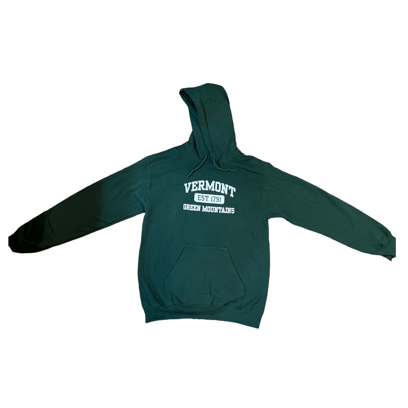 The deep forest green fabric is tastefully complemented by the bold, white print declaring "VERMONT EST. 1791 GREEN MOUNTAINS," proudly showcasing the state’s historic roots and natural beauty. Printed right in Vermont, this hoodie features a roomy front pocket, adjustable drawstring hood, and ribbed cuffs and hem, offering both functional warmth and a snug fit.