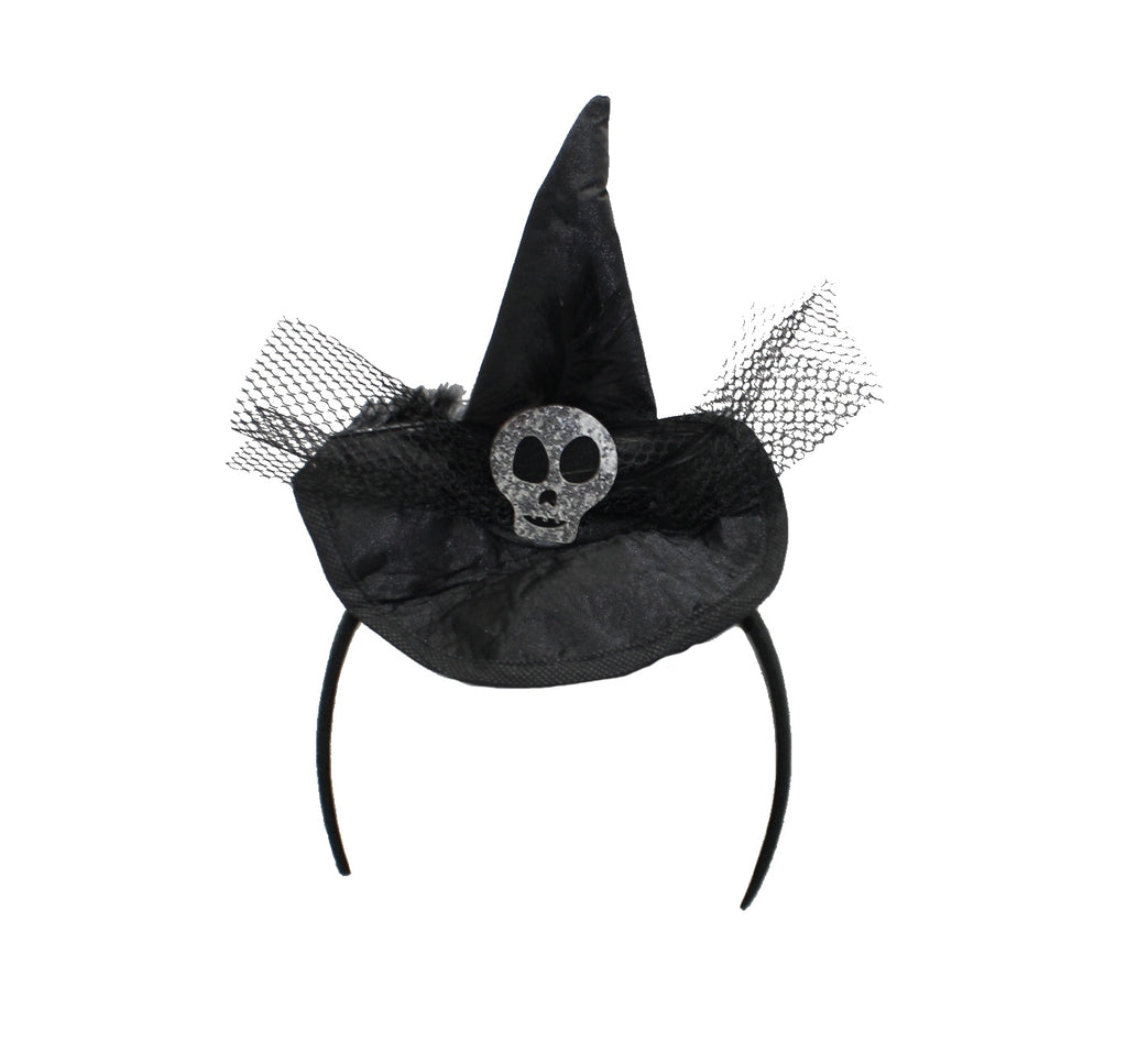 Witch Hat Headband with easy to fit one size fits most headband. Trimmed with feathers, glitter skull, and fabric mesh.