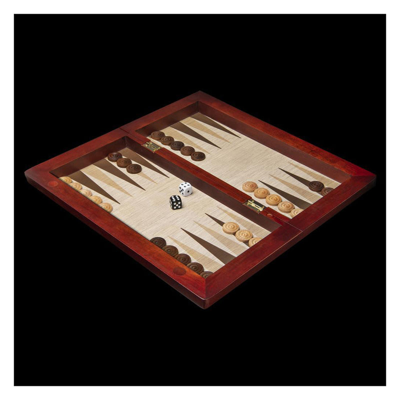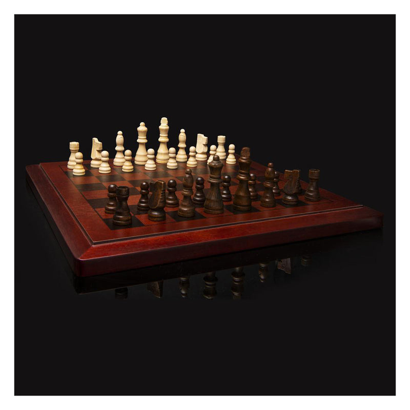 Includes everything needed to play Chess, Checkers or Backgammon, all with an interchangeable wooden board.