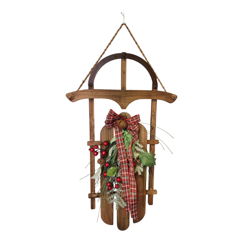 Bring the timeless charm of a rustic winter wonderland to your home with this exquisite 27-inch tall wooden sled wall decoration. Expertly crafted from wood and complemented by a sleek, curved metal frame, this sled features a festive adornment of plaid ribbon, green pine sprigs, red berries, and charming holly leaves. The combination of the weathered wood finish and plaid bow evokes nostalgic memories of classic winter joy and holiday spirit.